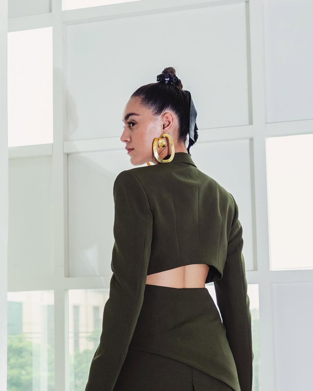A blazer dress with cut-out details, paired with a sculpted skirt-style belt for a sculpted look.