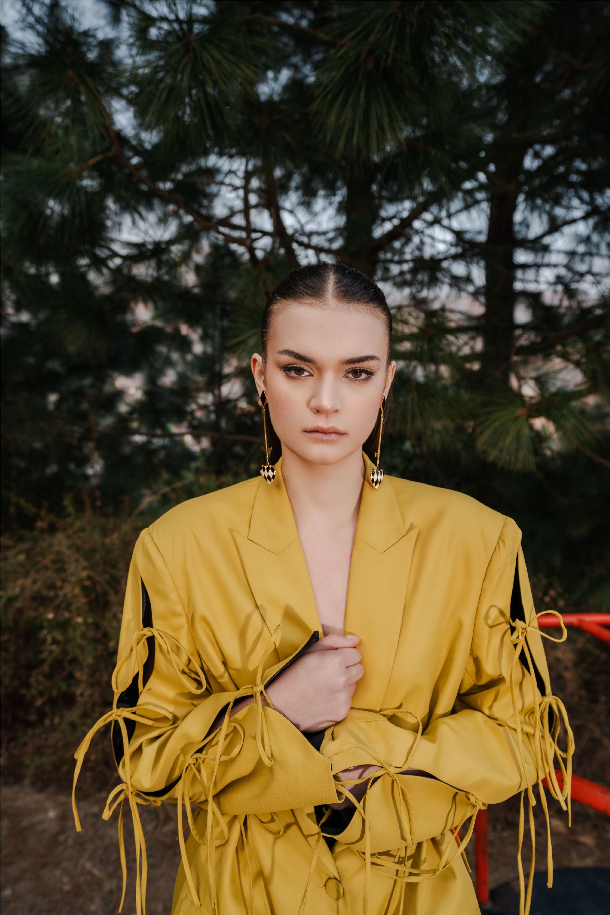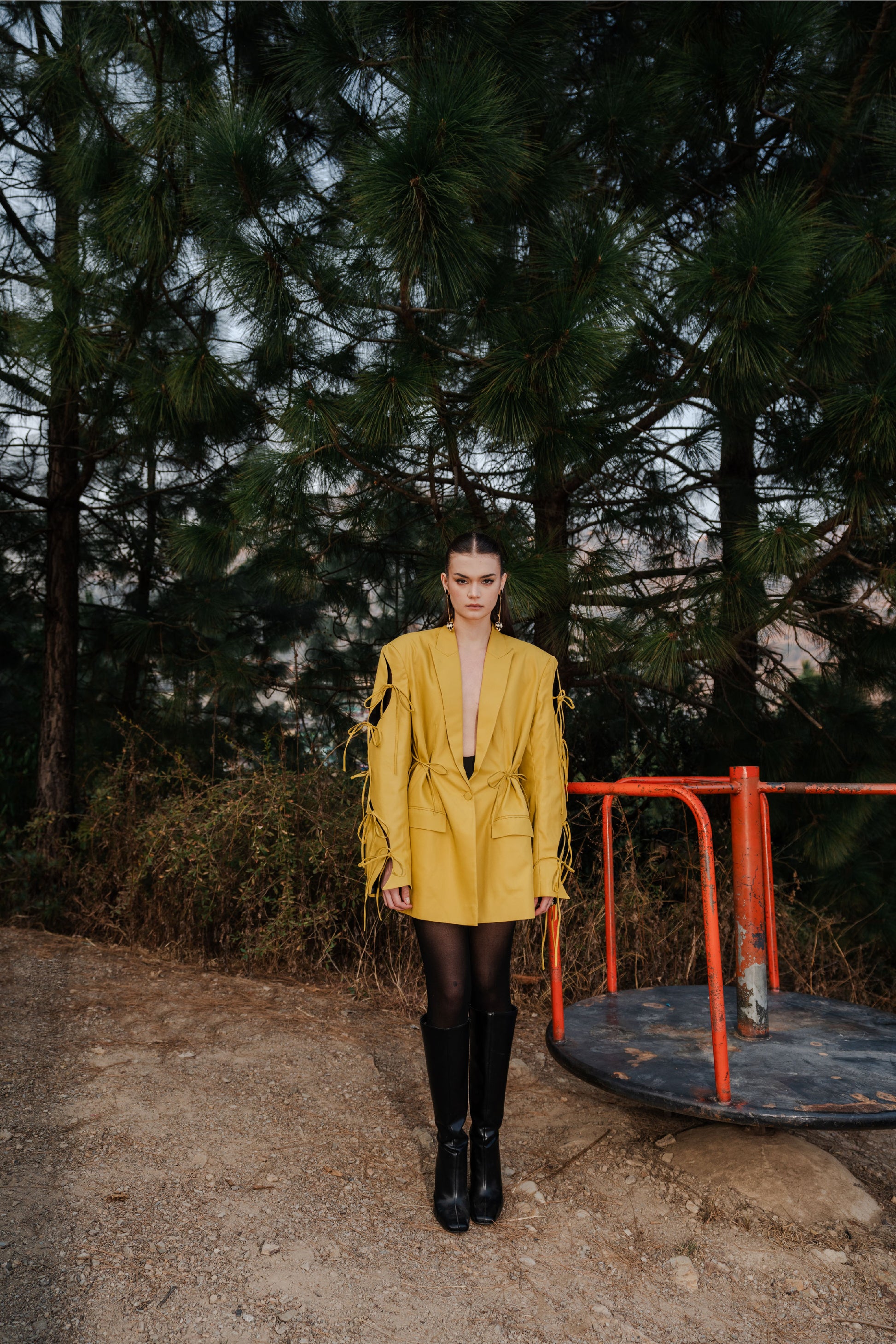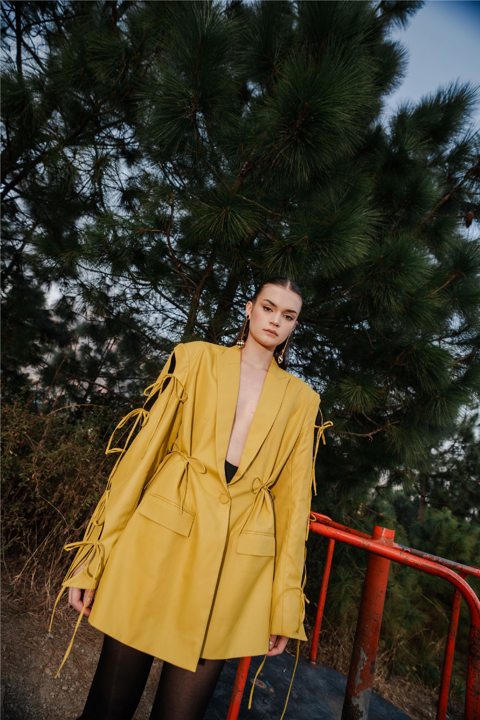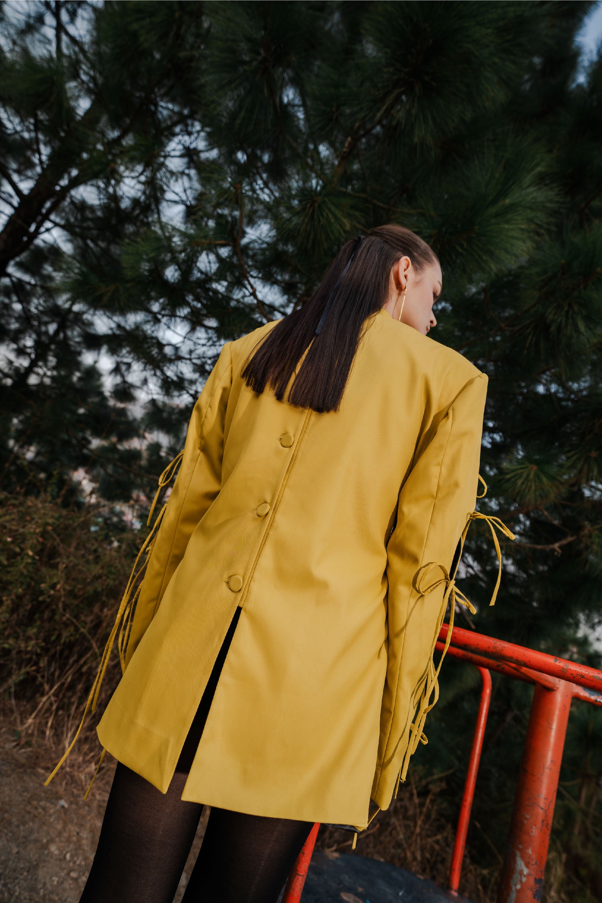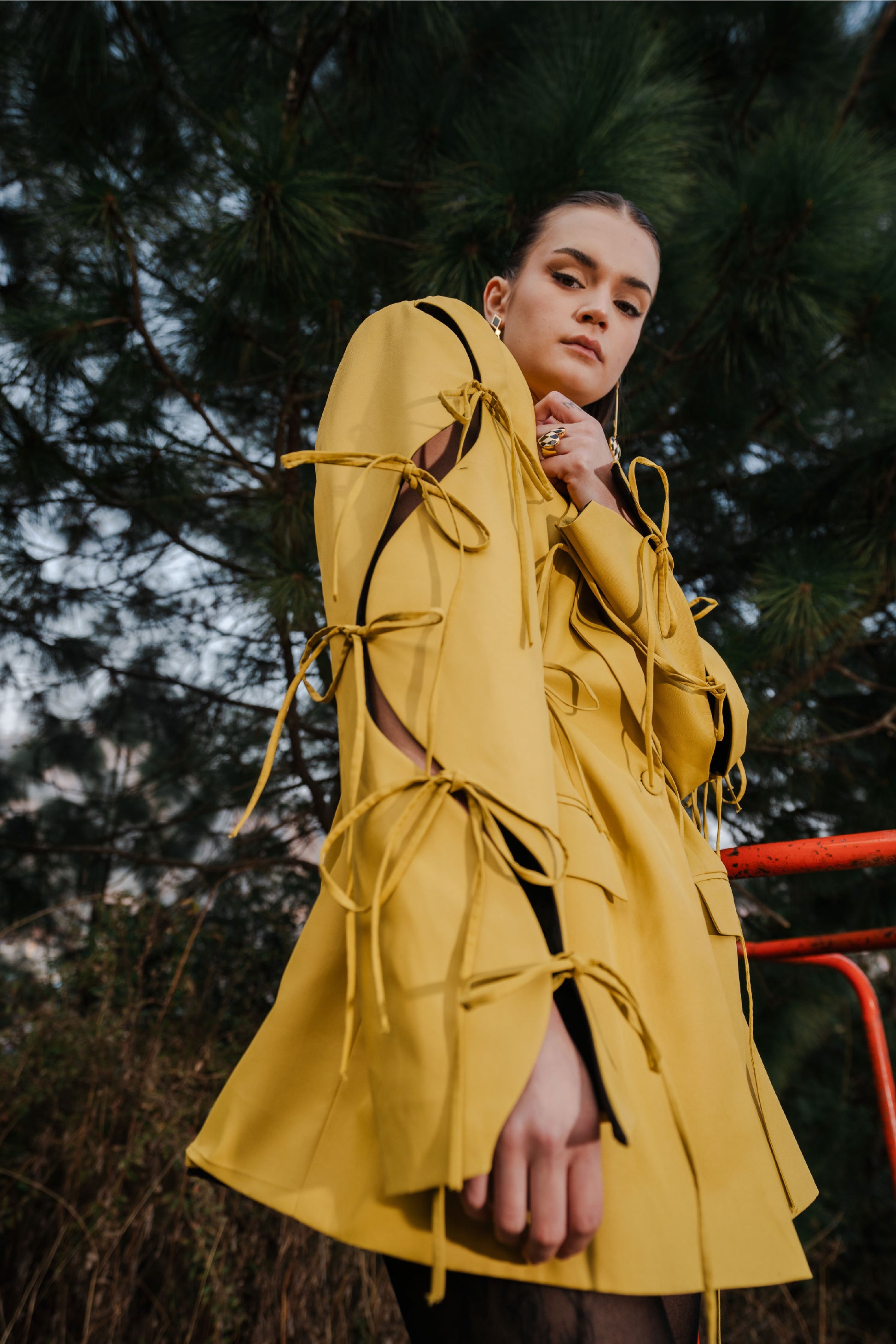 An oversized tailored blazer with tie-up sleeve details and a drawstring waist for a perfectly cinched silhouette.